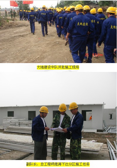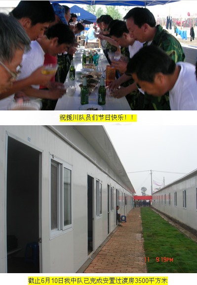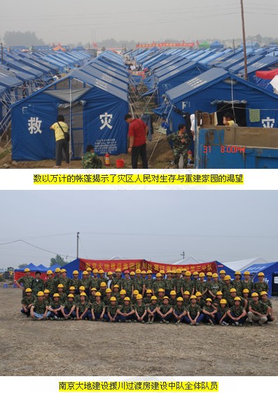 南京大地建設援川過渡房建設中隊,于5月24日奉命緊急赴川,日夜兼程,經過32個小時的長途跋涉,行程1900公里,于5月27日凌晨2:00到達棉竹災區。在市建工局建設大隊的統一領導下,立即投入到過渡房建設籌備工作中去。災區施工現場條件異常艱苦,晴天塵土蔽日,雨天泥濘濕滑,供水、供電不正常。山區海拔近4000米,日照強烈,我們的隊員近70%都被烈日灼傷過皮膚。帳篷里白天溫度高達42度,夜晚僅有10多度。就是在這樣的條件下,全體隊員心系災區人民,積極勤奮地全力以赴投入到工作中去。