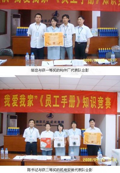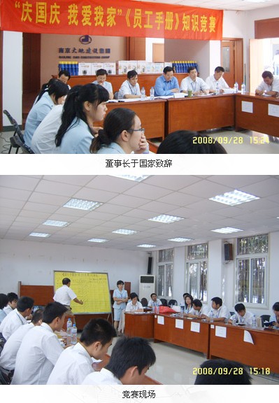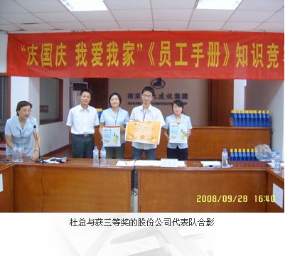 2008年9月28日,國慶長假前的最后一個工作日,公司工會組織了一場別開生面的“慶國慶,我愛我家,《員工守則》知識競賽” 活動,寓教于樂,現場氣氛熱烈。集團選拔了集團機關、股份公司、構件廠、房地產公司等十支代表隊參賽。活動由工會主席楊如明主持,公司領導董事長于國家、黨委書記陳慶生、常務副總鄒志堅等參加了本次活動。