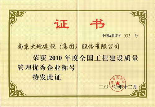 近日,經(jīng)中國(guó)建筑業(yè)協(xié)會(huì)、全國(guó)工程建設(shè)質(zhì)量管理優(yōu)秀企業(yè)評(píng)審委員會(huì)審定,南京大地建設(shè)(集團(tuán))股份有限公司榮獲“2010年度全國(guó)工程建設(shè)質(zhì)量管理優(yōu)秀企業(yè)”稱(chēng)號(hào)。