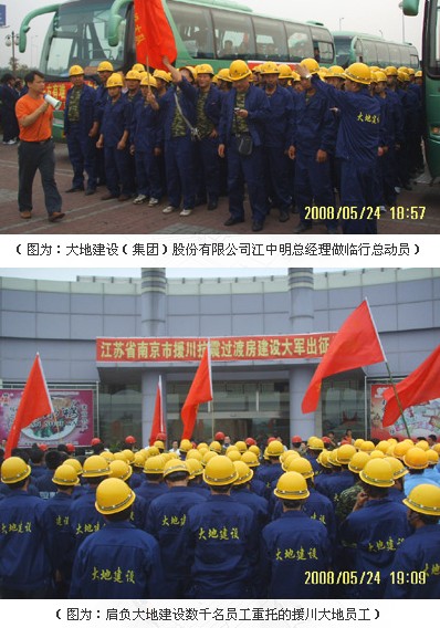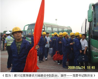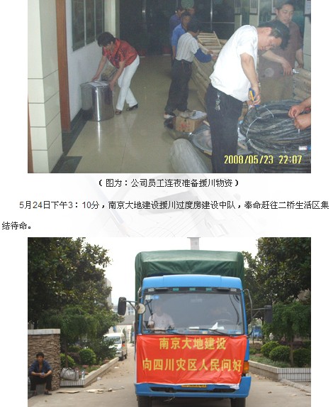必須在短時間內完成,隨時待命出發。時間緊任務重,會后集團公司黨委陳慶生書記、股份公司總經理江中明、集團公司工會楊如明主席按照建工局的要求,迅速成立了工作小組,全力以赴投入到組建工作中去。23號上午大地建設援川過度房建設中隊成立。黨委陳慶生書記親自帶隊,股份公司副總經理、總工程師龐濤任分隊副隊長。同時,股份公司從各職能部門抽調管理人員組建了強有力的管理班子,并分別從5個項目部抽調了60名工人整裝待命。股份公司總經理江中明親自布置各職能部門立即投入到物資準備工作中去。 到5月23日晚11:00,施工小型機具、施工工具、生活保障品全部到位。
