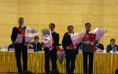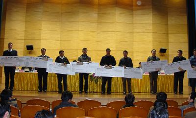 伴隨著高亢激揚的音樂聲,公司對09年度的最佳團隊、先進團隊、大地之星、最佳個人等榮譽稱號獲得者進行了現(xiàn)場表彰,對超額完成年度目標的優(yōu)秀基層單位現(xiàn)場兌現(xiàn)了獎金。