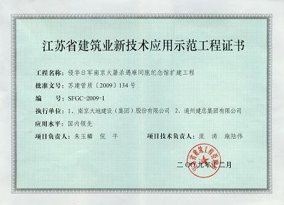 我公司承建的“侵華日軍南京大屠殺遇難同胞紀念館擴建工程”于09年下半年通過了第六批全國建筑業新技術應用示范工程的專家評審,結論為:應用新技術的整體水平達到“國內領先水平”。另外,本工程還被江蘇省建管局批準為“江蘇省第一批綠色施工示范工程”。該工程應用了建設部“建筑業十項新技術”的10大項17小項,江蘇省新技術4項,創新技術3項。該工程于近日取得了“江蘇省建筑業新技術應用示范工程證書”。