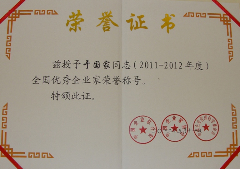 集團公司董事長于國家榮獲“全國優秀企業家”殊譽