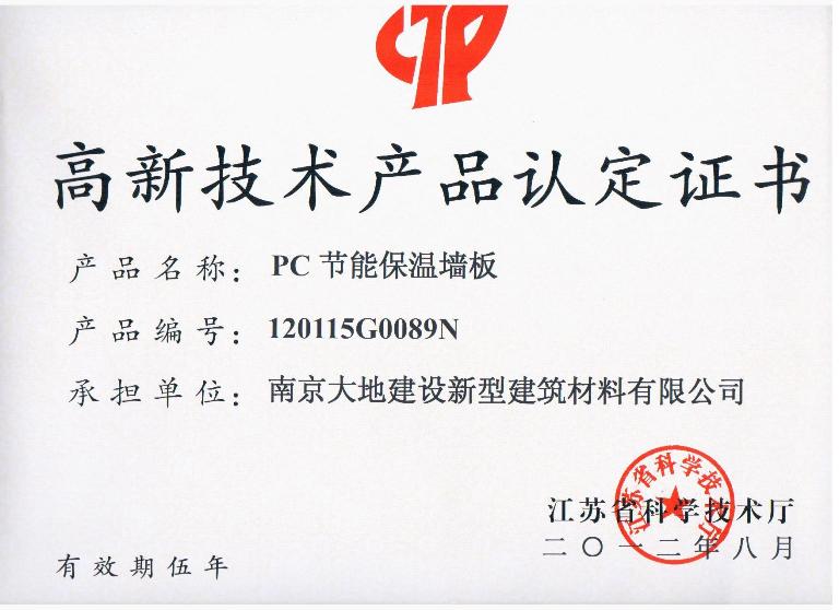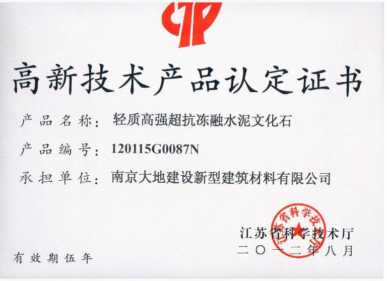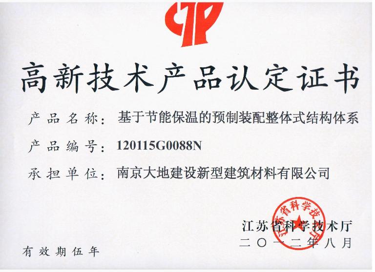 近日,由江蘇省科技廳組織的2012年江蘇省第二批高新技術產(chǎn)品認定結果已經(jīng)公布。經(jīng)專家們的認真評議、審核,南京大地建設新型建筑材料有限公司的三項產(chǎn)品憑借其綠色、節(jié)能、環(huán)保、優(yōu)質(zhì)等特性被認定為高新技術產(chǎn)品。三項產(chǎn)品分別為:基于節(jié)能保溫的預制裝配整體式結構體系(產(chǎn)品編號:120115G0088N)、PC節(jié)能保溫墻板(產(chǎn)品編號:120115G0089N)、輕質(zhì)高強超抗凍融水泥文化石(產(chǎn)品編號:120115G0087N)。