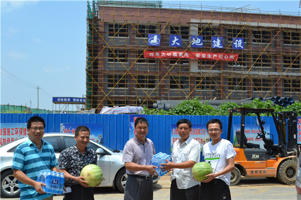 7月24日、25日機電分公司領導郭應華、肖志勇赴匯杰02、03~06、07地塊、金輪新都匯、下關政法大廈等16個項目現場,向奮戰在施工一線的廣大員工,致以崇高的敬意、衷心的感謝和親切的慰問!并送上高溫慰問品兩車西瓜和礦泉水,為辛苦奮斗的廣大員工送去夏日的一絲清涼。