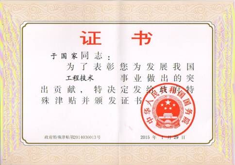 國家人社部2015年1月29日發(fā)文,經國家人社部批準,于國家董事長榮獲2014年享受政府特殊津貼人員榮譽。于近日頒發(fā)了榮譽證書。