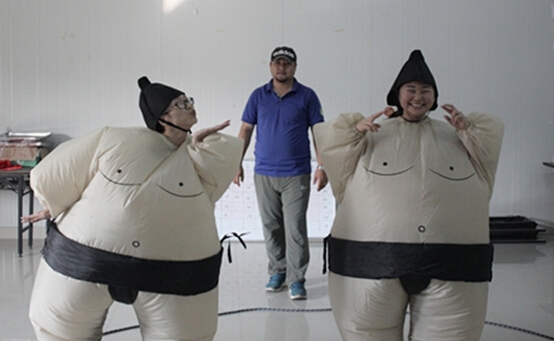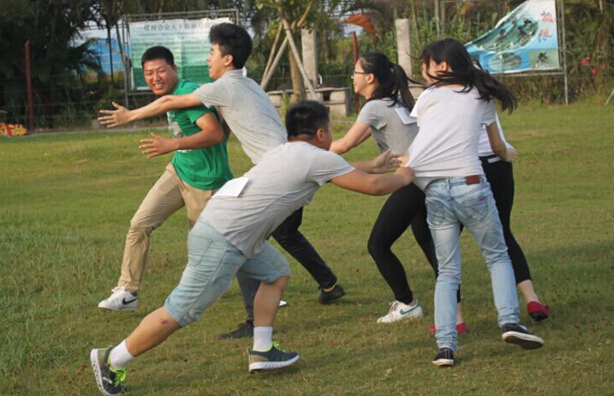 拓展訓練的現場洋溢著緊張、歡樂的氣氛。開場的破冰游戲讓小伙伴們拋開工作煩惱,消除同事之間的隔膜,投入到拓展訓練中來。握手擁抱互相熟悉之后,拓展教練將參加人員分為兩個組,規定在有限時間內由隊員選出來的隊長要帶領大家確定出隊名、隊伍口號和隊歌,大家迅速融入其中。兩個小組分別取名為“余家幫”和“超能陸戰隊”,余家幫的隊歌《團結就是力量》鏗鏘有力,而超能陸戰隊的隊歌《青春修煉手冊》則勝在青春活力“萌萌噠”。兩隊在隊伍士氣展示環節也是激情高昂、不相伯仲。