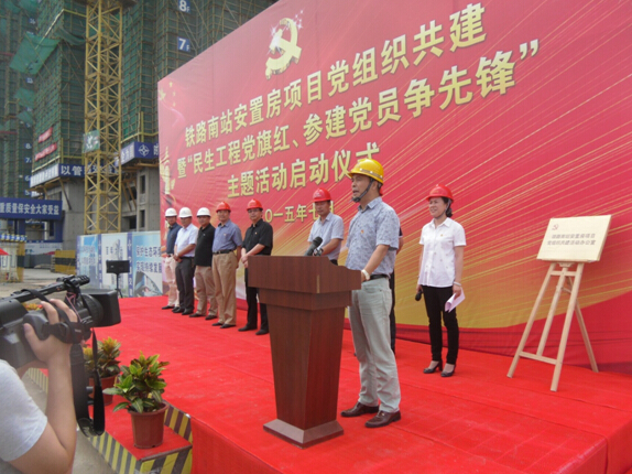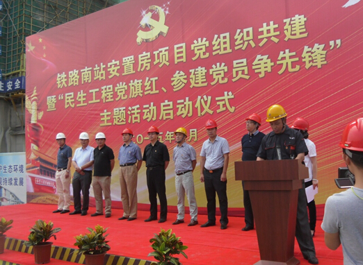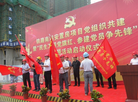 為推進基層黨組織建設,在南京交通投資置業有限公司黨總支的倡導下,2015年 7月1日我們偉大的黨94周年生日之際,股份公司黨委、中交四公司黨組織、黑龍江建工黨組織,在中交龍西項目部隆重舉行了鐵路南站安置房項目黨組織共建 “民生工程黨旗紅、參建黨員爭先鋒”主題活動啟動儀式。