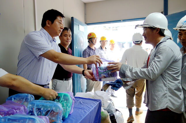 劉方寧、劉斌兩位領導把毛巾、沐浴露、花露水等慰問品送到了工人們的手中,代表南京市總工會及城建工會向冒著酷暑堅守在工作崗位上的一線員工表示親切的慰問,并叮囑他們要注意勞逸結合,做好防暑工作,注重安全生產,確保高溫期間施工建設生產安全有序。上級領導的關心和關愛,深深地感動著每一位職工,大家表示一定不辜負領導的期望,認真做好建筑施工安全生產工作,高標準高質量為南京城市建設做出貢獻。
