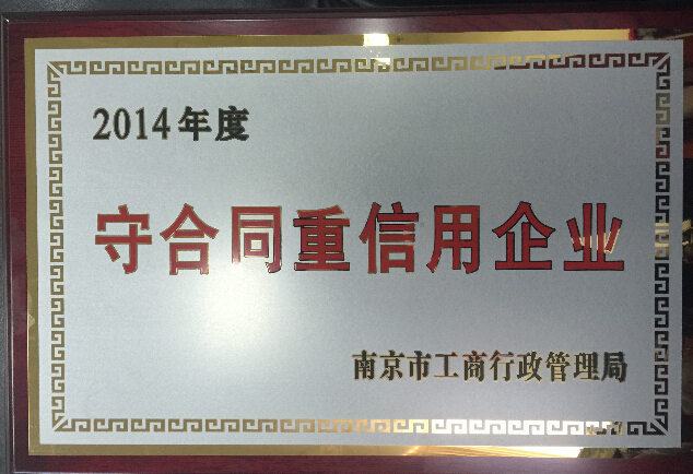 2015年8月,我公司榮獲南京市2014年度“守合同重信用”企業。“守合同重信用”企業是國家工商管理部門對企業在合同信用方面的重要評價,旨在推進企業誠信建設,規范企業合同行為,促進經濟社會持續健康發展。我公司連續多年榮獲“守合同重信用”企業。