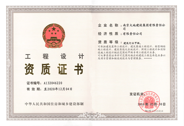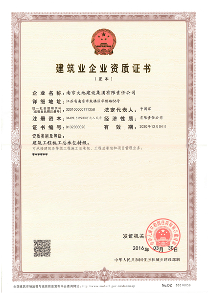 2016年4月15日上午,南京市城鄉(xiāng)建設(shè)委員會(huì)給我公司送來了“賀信”,祝賀大地建設(shè)成功晉升國家建筑工程施工總承包特級(jí)資質(zhì),成為南京市首家同時(shí)擁有建筑行業(yè)甲級(jí)設(shè)計(jì)資質(zhì)的特級(jí)企業(yè)。賀信中說:“南京大地建設(shè)集團(tuán)有限責(zé)任公司申報(bào)特級(jí)資質(zhì)取得成功,為承上啟下我市建筑業(yè)發(fā)展‘十二五’和‘十三五’規(guī)劃起到完美收官和良好開局的作用,為全市建筑施工企業(yè)晉升特級(jí)資質(zhì)樹立了傍樣。”