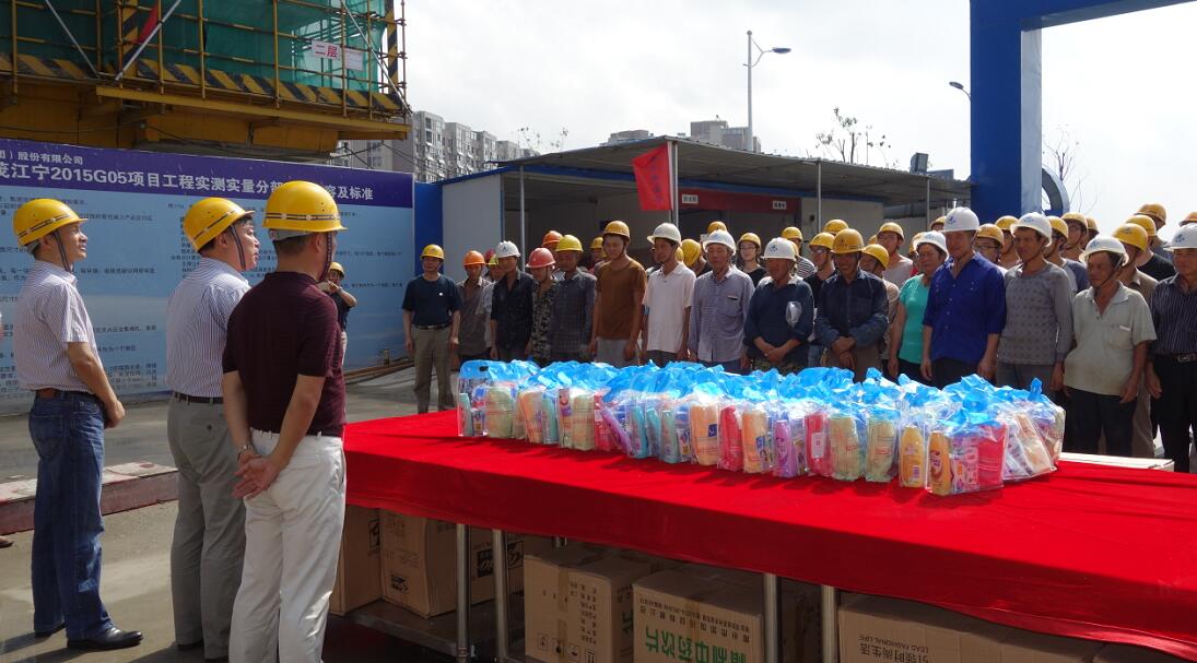 聞慶武 、劉斌兩位領(lǐng)導(dǎo)在江寧世茂項(xiàng)目部工地親切看望慰問奮戰(zhàn)在一線的施工人員,與現(xiàn)場施工的工人們親切握手,并把毛巾、香皂、洗發(fā)水等慰問品送到了施工工人手中,對(duì)他們不畏高溫、堅(jiān)守崗位、辛勤勞動(dòng)表示誠摯感謝,并親切叮囑工人們高溫期間要注意勞動(dòng)保護(hù)和安全。兩位領(lǐng)導(dǎo)還向現(xiàn)場施工負(fù)責(zé)人詳細(xì)詢問了工程進(jìn)展和施工人員的生活條件等有關(guān)問題,囑咐各有關(guān)部門要合理安排時(shí)間,避開高溫時(shí)段施工,給施工人員足夠的睡眠,盡可能的為他們創(chuàng)造涼爽的休息環(huán)境,保持充沛的精神,繼續(xù)為建設(shè)美好南京貢獻(xiàn)力量。