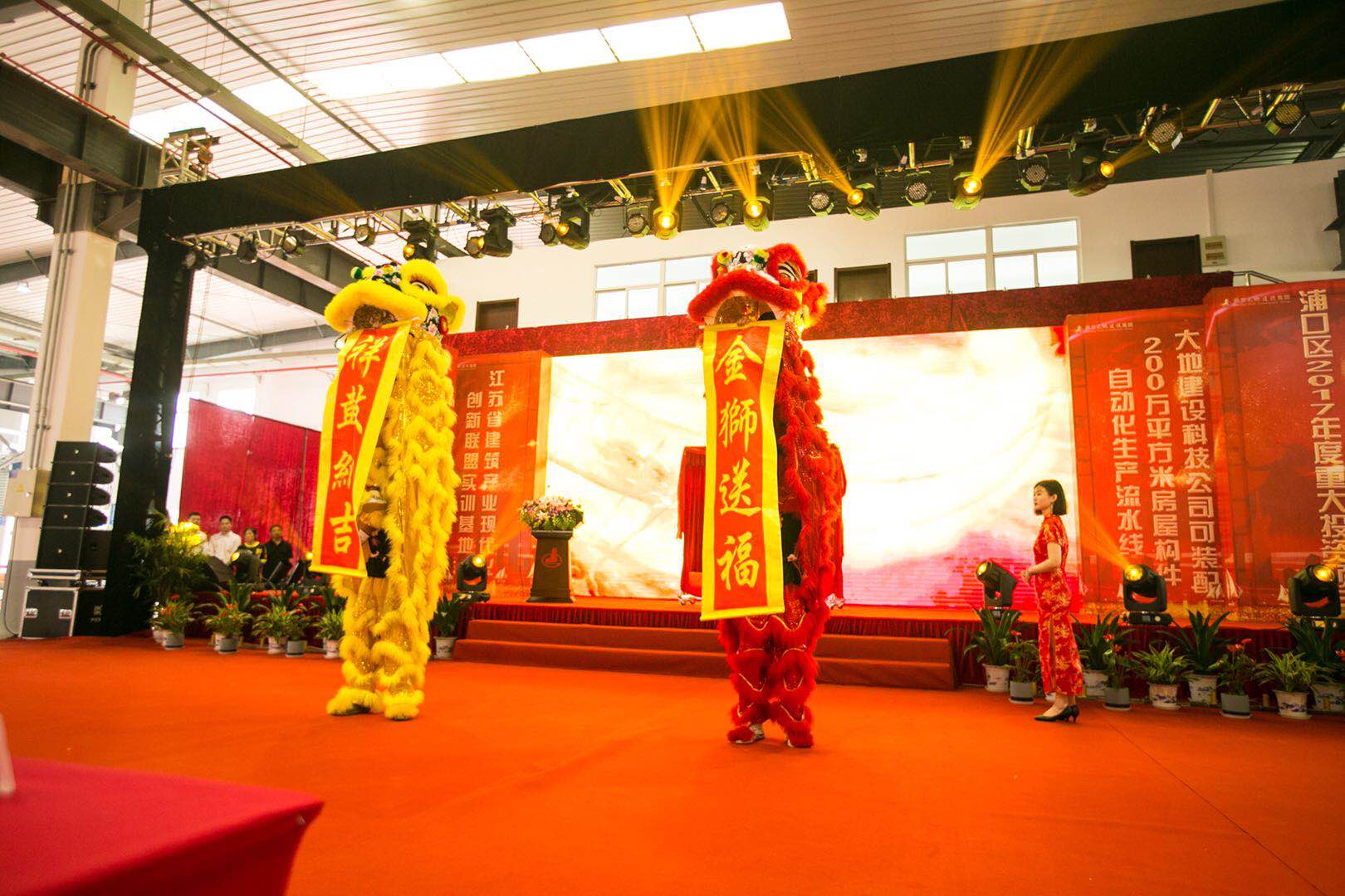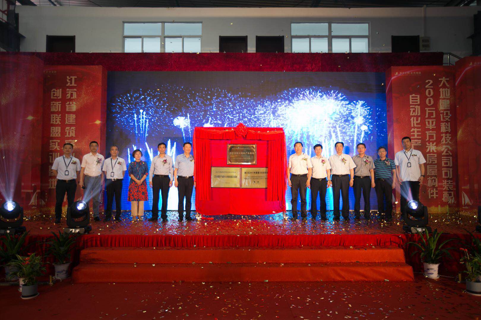 2018年5月18日,對大地建設集團而言,是具有重要紀念意義的喜慶日子。當天出席揭牌儀式和落成投產儀式的主要領導和嘉賓有:江蘇省住建廳、江北新區管委會、江蘇省建筑業協會、南京市建筑業協會及星甸街道、六合區開發區管委會、浦口區安居集團、浦口區建工局、長江都市設計院、東南大學、銀行金融界、南京新聞綜合頻道、南京日報等宣傳媒體的各位領導近200人,相聚南京大地建設科技公司星甸新廠區,共同見證大地建設集團發展進程中的重要歷史時刻:大地建設集團“國家裝配式建筑產業基地”、“江蘇省建筑產業現代化創新聯盟實訓基地”的揭牌儀式暨浦口區2017年重大投資項目“大地建設科技公司可裝配200萬㎡房屋構件自動化生產線”落成投產典禮。典禮由大地建設集團董事長伍貽安主持。