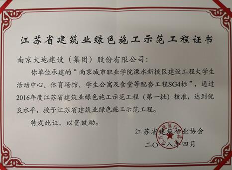 近日,江蘇省建筑行業協會綠色施工分會第七屆一次會議代表大會順利召開,會上傳來喜訊,我公司承建的南京城市職業學院溧水新校區建設工程SG4標項目榮獲江蘇省建筑業綠色施工示范工程,南京市僅有三項工程獲此殊榮。