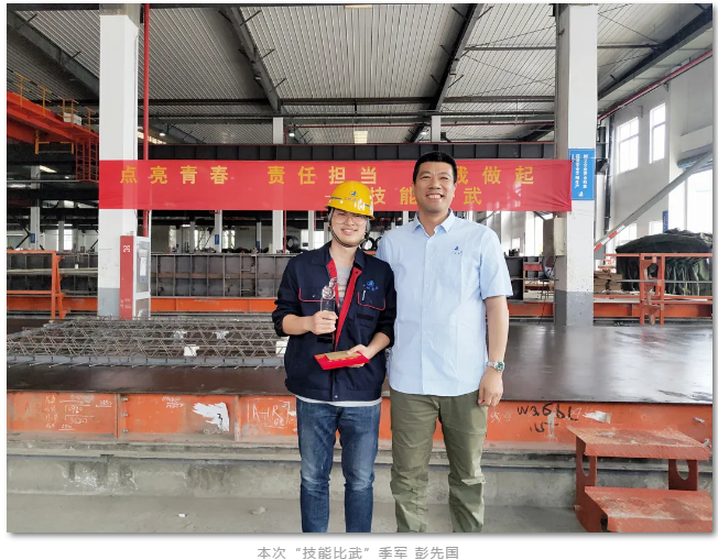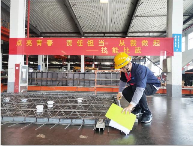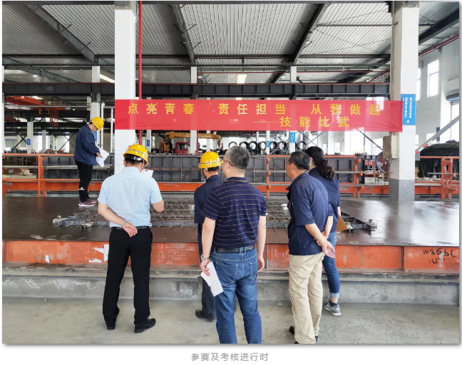 理論知識競賽角逐出前10名選手,于5月21日12:00進入實踐操作競賽環節。裁判組由科技公司總工程師、技術中心主任、質量科長組成。實操競賽內容為預制疊合板構件隱蔽工作檢驗,即在隱蔽中設置預留預埋偏差(或缺少)、模具安裝偏差、鋼筋偏差等缺陷,由參賽人員對照圖紙,比照實物找出缺陷,并填寫記錄。