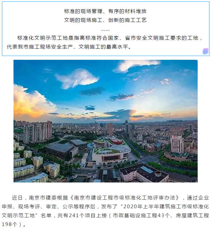 7月15日,“南京建設”微信公眾號公布了南京市“2020年上半年建筑施工市級標準化文明示范工地”名單,我司承建的南京一中分校項目、六合科創園一期項目、棲霞紅楓保障房項目、智能家居項目脫穎而出,榮獲該稱號!未來大地將再接再厲,再創精品!
